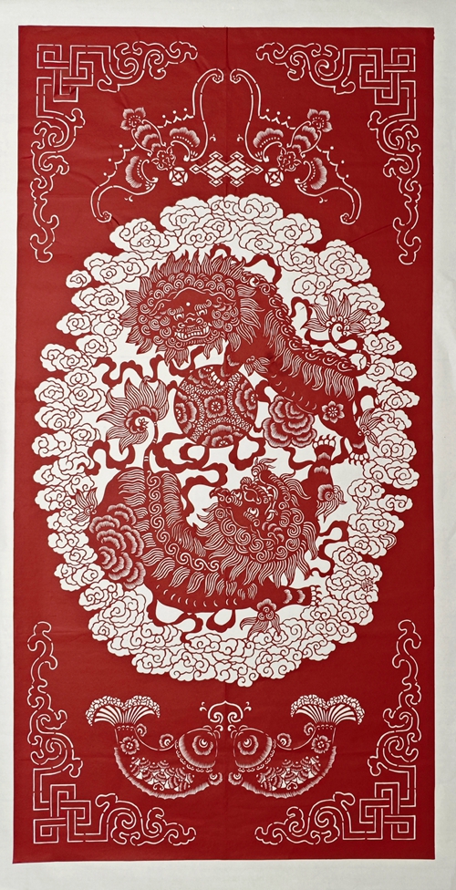 作品简介:剪纸作品《狮舞升平》以春节的红火年味为底色,借传统剪纸的朱红线条,将祛灾祈福、吉祥贺岁的新春祈愿揉进一纸之中。双狮戏绣球的灵动姿态,跃出春节庙会常见的欢腾活力;牡丹缠枝裹着富贵繁昌的年景,祥云翻涌载满天赐祥瑞的吉意,上轴蝙蝠衔福、下轴双鱼游曳,恰好凑成“福庆有余”的新春祝福。