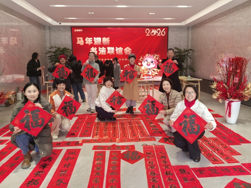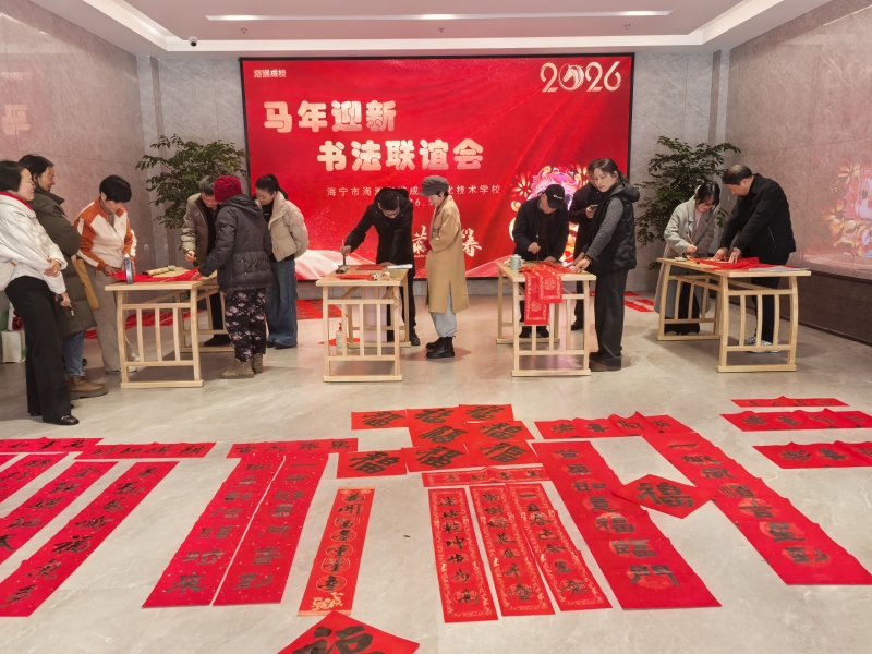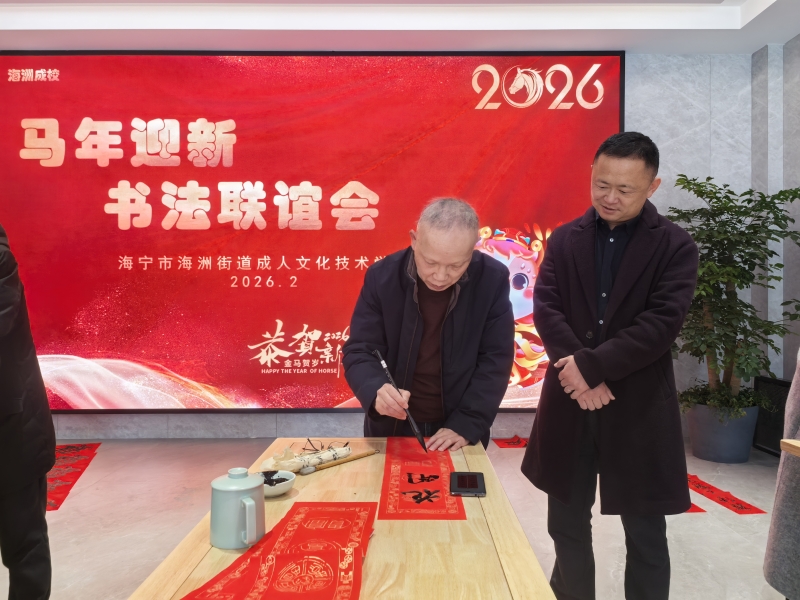 岁末冬寒,墨暖情长。2026年2月5日,海宁市海洲街道成人文化技术学校一楼大厅内暖意融融、墨香四溢,一场主题鲜明的“马迎新”书法联谊活动热闹启幕。学校邀请了张国良老师与王培源老师携手领衔,带领数十名书法学员齐聚一堂,以笔为媒、以墨传情,在大红宣纸上挥毫泼墨书写春联,用传统笔墨韵味勾勒新春喜悦,为即将到来的丙午马年增添了浓厚的节日氛围。