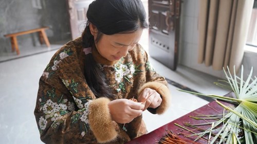 如今,顾云华的草编原料越来越丰富:棕榈叶、松针、蒲草,大多是她从野外细心收集而来。“松针是上次村里组织健走,在鼠尾山捡的。”她笑着说。经过生态修复,昔日的废弃矿山已变成绿意盎然的鼠尾山公园,山上掉落的松针,在她眼里都是宝贝。