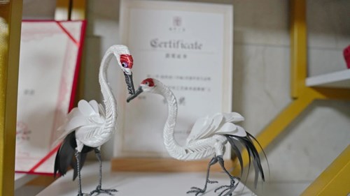 她一边演示一边介绍:编蛇时,尾巴要细,就把草叶剪得纤细;肚子要饱满,便逐步添草加叶,全凭手感把控,再依托铁丝固定出盘旋灵动的姿态。