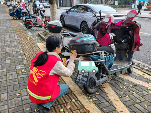 上午9时,身着红马甲的志愿者们兵分两路:一组在群利路与水月亭路路口,耐心引导行人与非机动车遵守交规,对越线停车、未戴头盔等行为进行温馨提醒,用微笑传递文明出行理念;另一组穿梭于非机动车停放区,为电瓶车粘贴“平安硖石”反光车贴,让夜间行车多了一份安全保障。